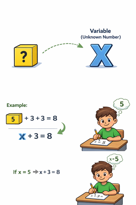 In earlier modules, you used empty boxes to represent unknown values. In algebra, we replace those boxes with letters so we can build real equations and solve bigger problems.