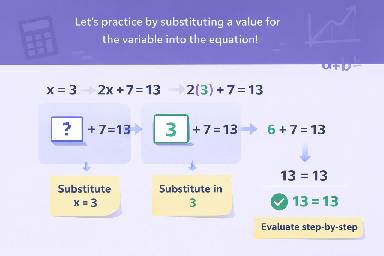 Now let’s practice using variables by replacing them with real numbers and solving step by step. This helps build confidence and understanding of how algebra works in action.
